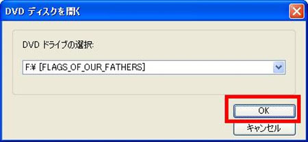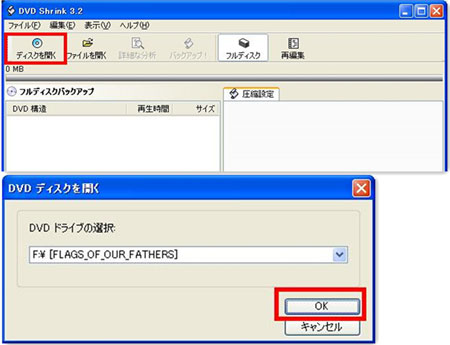 ステップ1: DVDをパソコンにセットします。DVD Shrinkを起動した後、メニュー左上の「ディスクを開く」→「ドライブの選択」をクリックし、DVDディスクをセットしたドライブを指定します。 「OK」ボタンで次へ進みます。